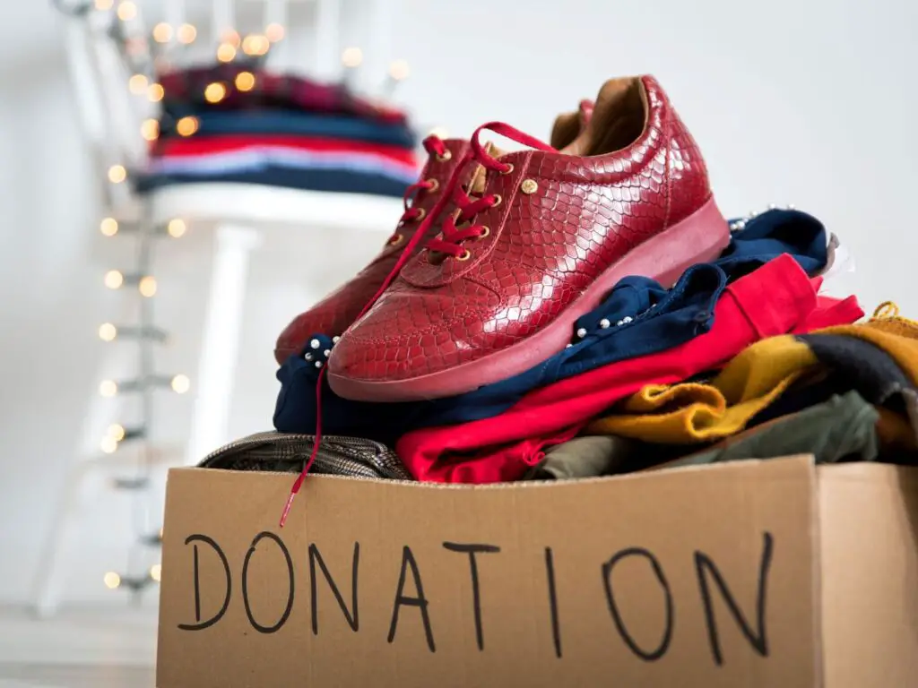 A cardboard donation box filled with clothes and red shoes, symbolizing in-kind giving and practical support methods for fundraising during recession.