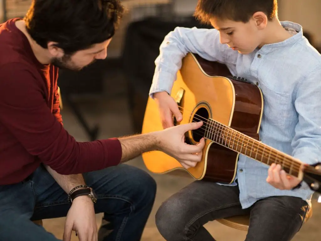 An adult teaching a young boy how to play guitar, capturing the value of skill-sharing and low-cost activities that support fundraising during recession.