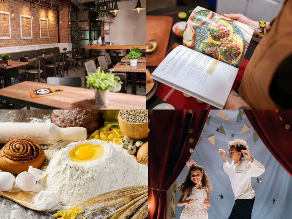 Collage of four images representing creative approaches to fundraising during recession: a cozy, empty restaurant set up for a potential charity dinner; someone flipping through a cookbook showing taco recipes, suggesting a fundraising cooking class; a tabletop scene with flour, eggs, cinnamon rolls, and pasta ingredients hinting at a bake sale or food kit fundraiser; and two children performing on stage with a whimsical curtain and star decorations, symbolizing a fundraising talent.