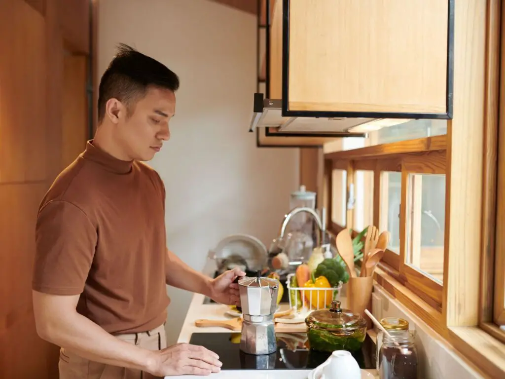 A man in a brown shirt preparing coffee at home with fresh vegetables and utensils around, representing budget-conscious living that aligns with the spirit of fundraising during recession.