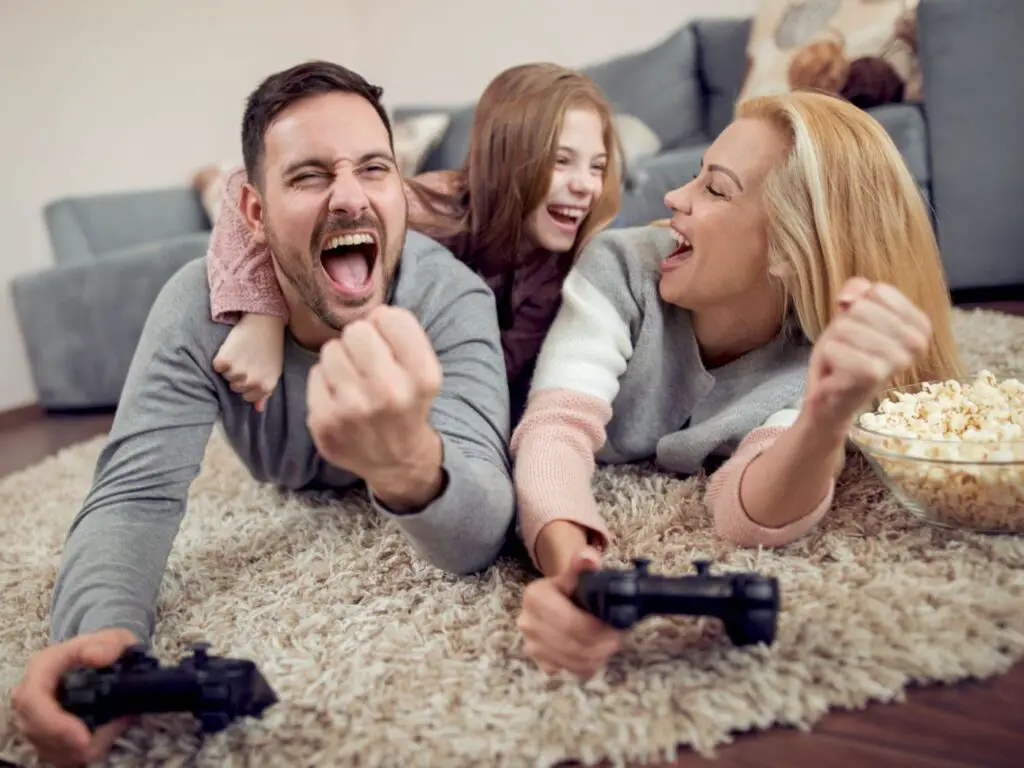 A joyful family lying on a rug, cheering while playing video games together, with a bowl of popcorn nearby highlighting affordable bonding moments ideal for fundraising during recession.