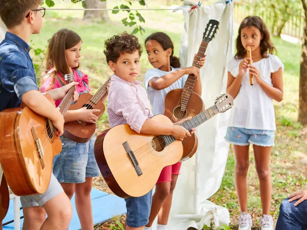 A group of children holding guitars and a recorder at an outdoor talent show, showcasing a creative community event perfect for fundraising during recession.